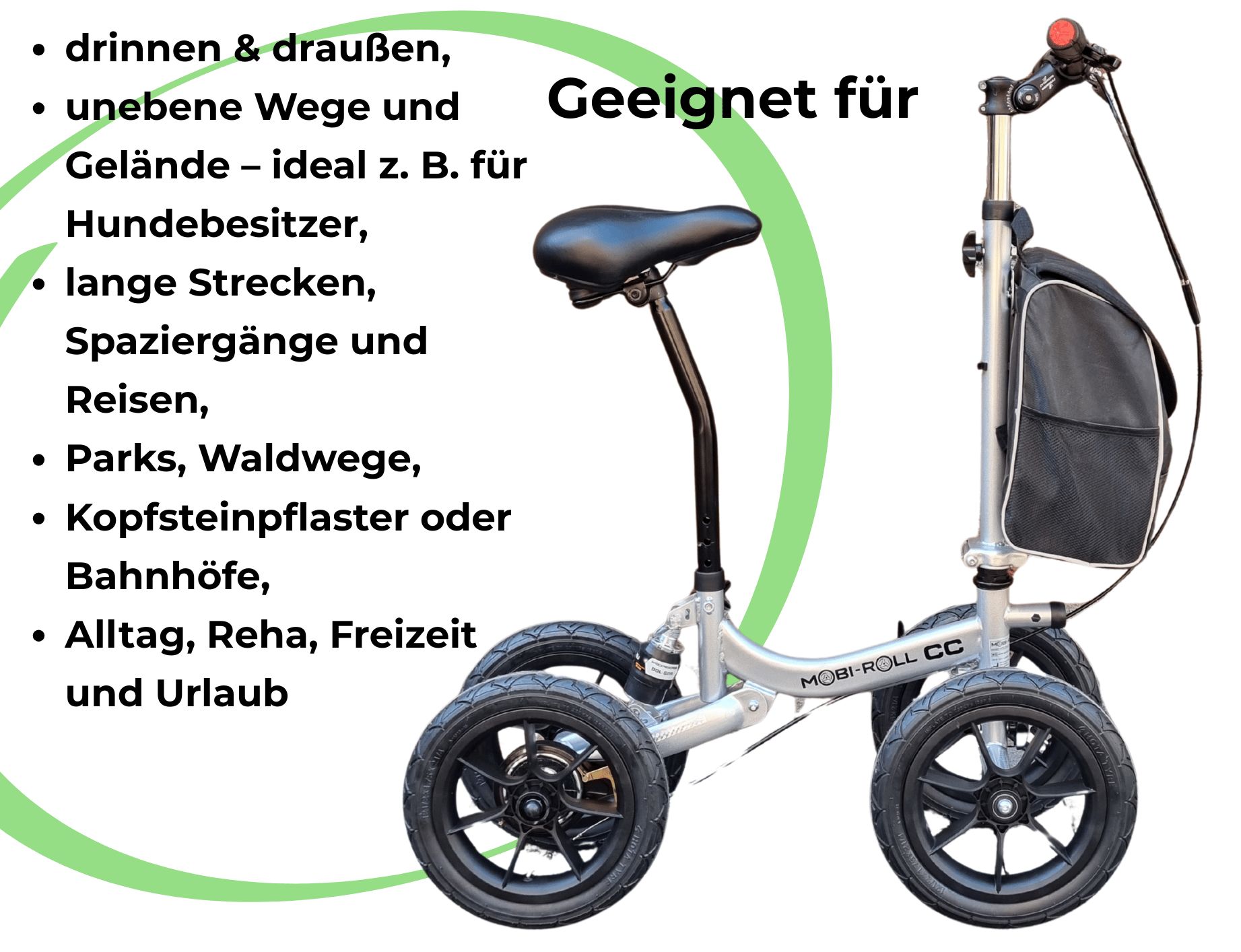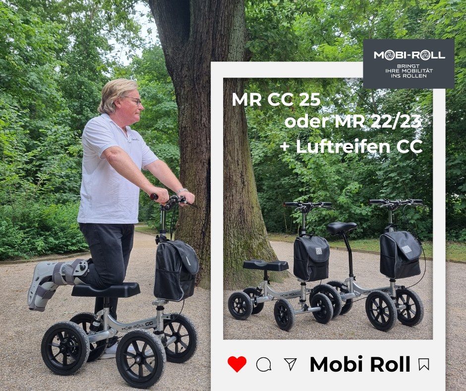 Standardmäßig mit 4x12"Luftreifen und Trommelbremse, Knieauflage auf Wunsch auch mit Umrüst-Kit als Sitzversion möglich. Bestens geeignet für Spaziergänge in leichtem Gelände und guten Feld/Waldwegen - für Hundebesitzer ideal. (Bitte beachten: Beinauflage wie beim Mobi-Roll S nicht nachrüstbar)
