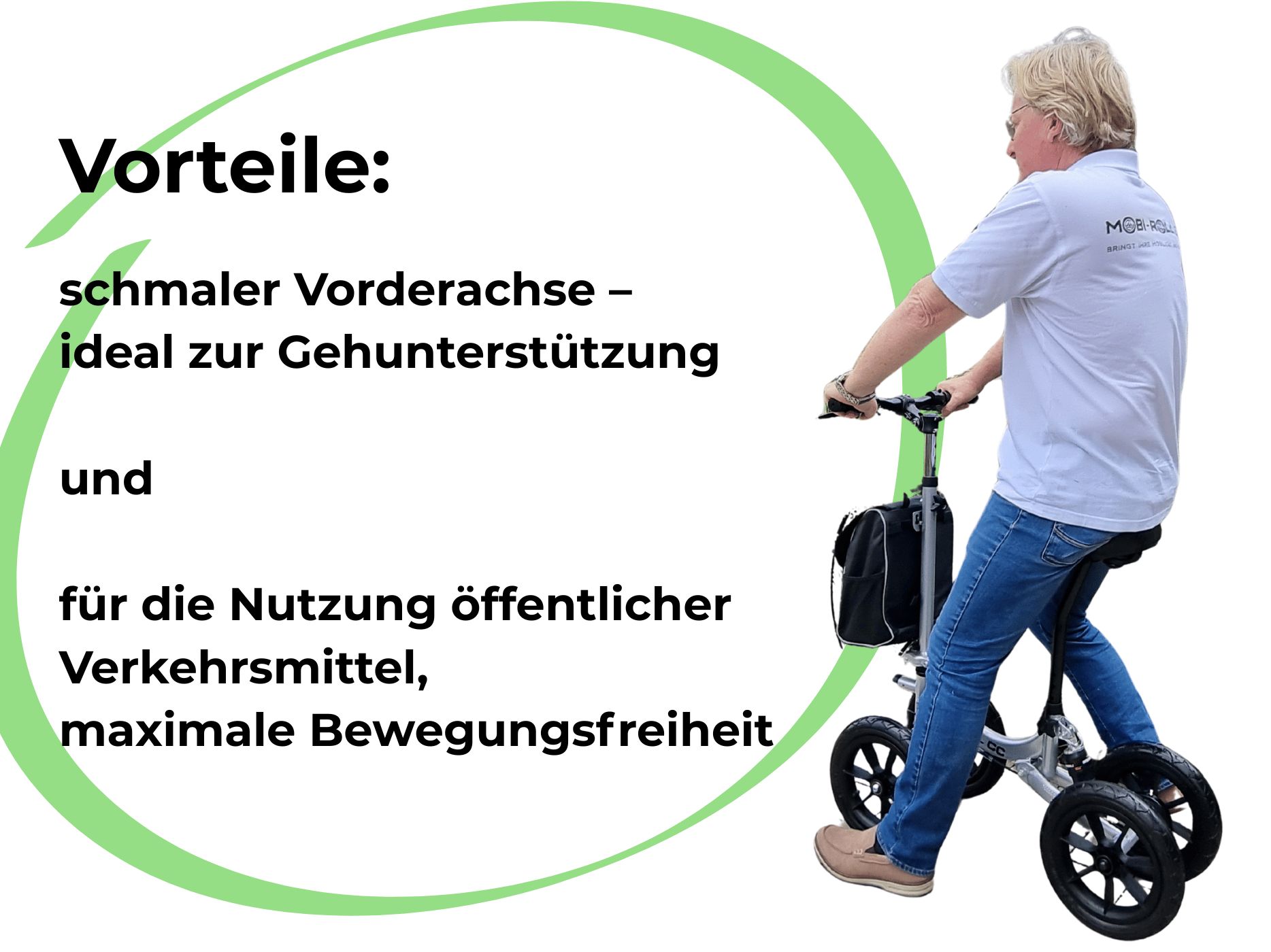 Im Vergleich zu Gehstützen oder Rollstühlen ermöglicht der Mobi-Roll eine bequeme, selbstbestimmte Mobilität – drinnen und draußen. Ihre Muskulatur bleibt erhalten, und Arbeiten wie Kochen oder Einkaufen werden problemlos machbar. Dank des spielerischen Fahrgefühls gehört die Belastung durch Gehstützen der Vergangenheit an.